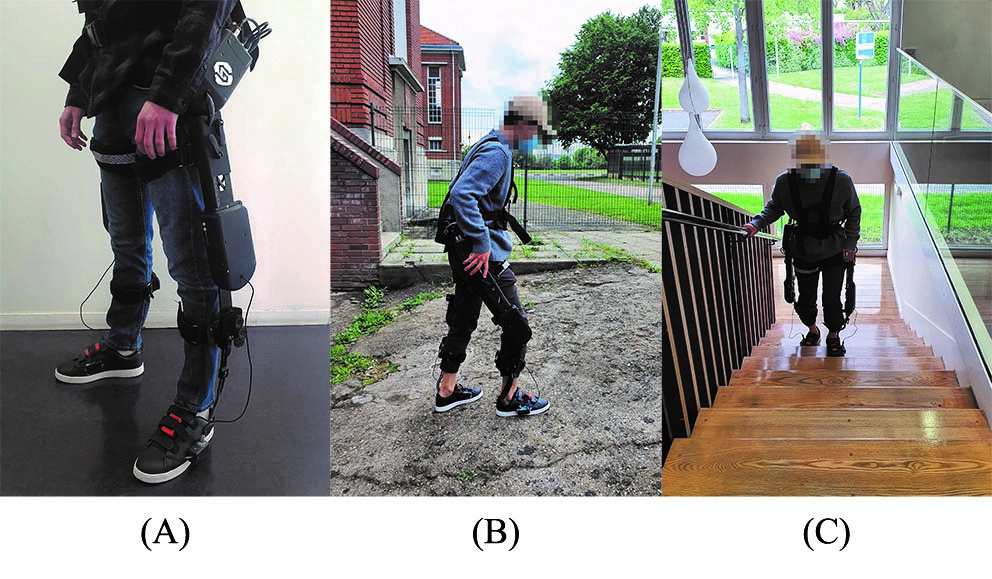 Experimental Device: To record the accelerations, velocities, and orientations of the subject’s feet while wearing the exoskeleton, two IMus (MTw Awinda, Xsens, Netherland) on both shoes (see Fig. 1 (A)) are used. The data are acquired from two IMUs using a 100 Hz sampling frequency on the development software (LABVIEW 2019, National Instruments, US).