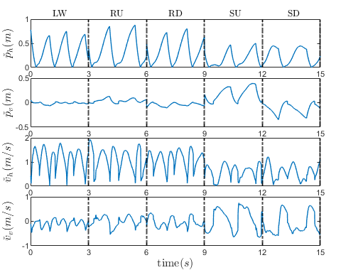 Experiment protocol: Ten healthy subjects (gender: 9 males, 1 female; age: 28±4 years; height: 1.74±0.05 m; weight: 66.8±10 kg) have participated in this study. Nine subject’s data are used for the learning process and the tenth subject data are used for the evaluation process. The experiments are conducted by each subject wearing the lower-limbs exoskeleton and performing five different gait modes: level walking (LW), ramp up (RU), ramp down (RD), stair up (SU), and stair down (SD) as shown in Fig. 1. During the data acquisition, the exoskeleton is in a passive mode, the segment lengths of the robot (shank and thigh) are adjusted to fit the subject’s height and to avoid misalignment between human and robot joints.