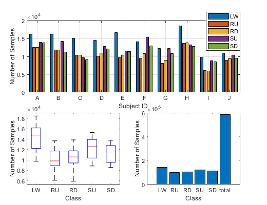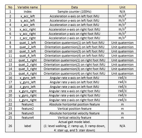 Figure 3 represents the statistical analysis of the dataset per subject and per gait mode class. The dataset folder contains each subject by “.csv” format files and it is constructed with the 26 variables as shown in Table 1.