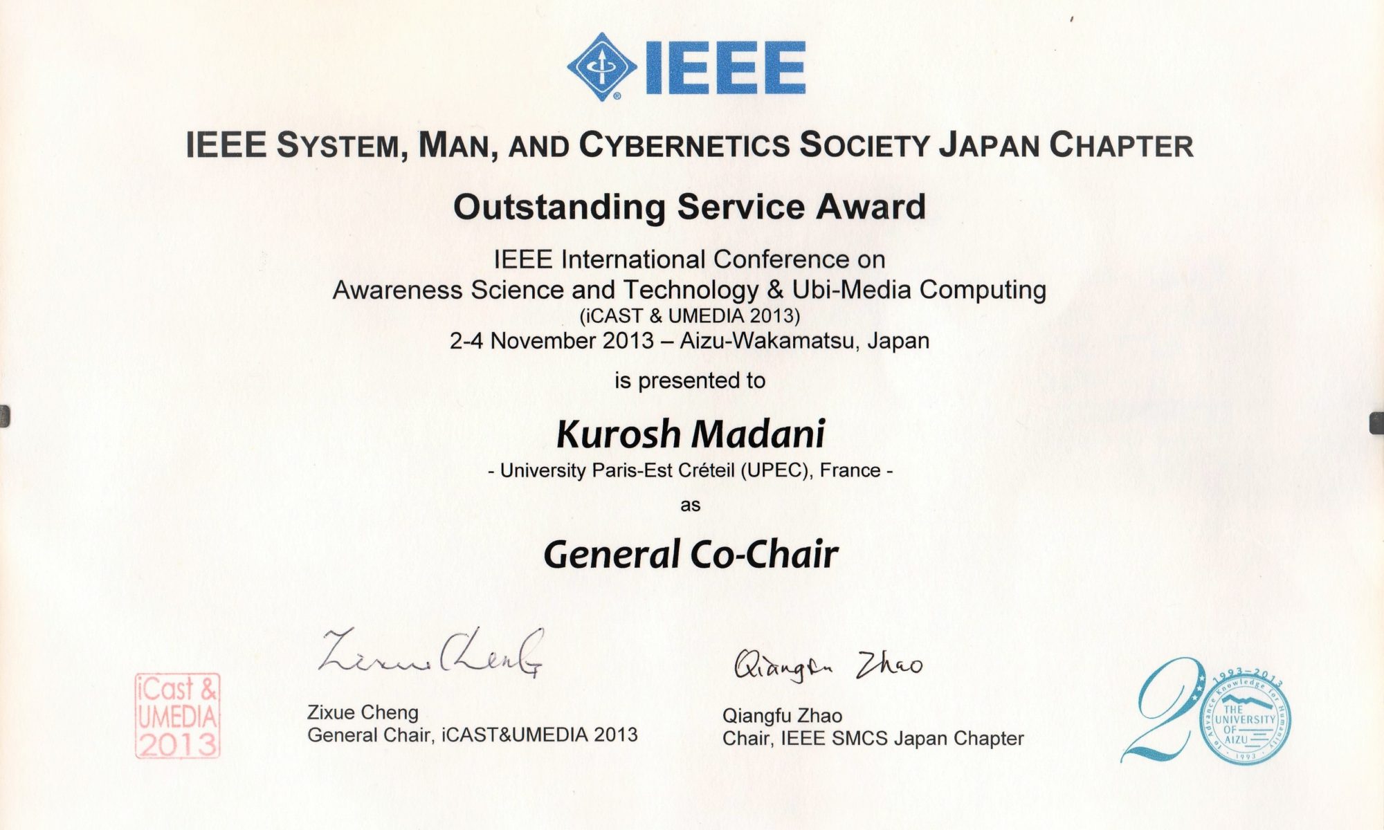 Kurosh Madani, a reçu le “Outstanding Service Award” décerné par l’IEEE System Man & Cybernetics Soc. / Japan Chapter, pour son implication en tant que General co-Chair dans la conférence "IEEE International Conference on Awareness Science and Technology, iCAST 2013"