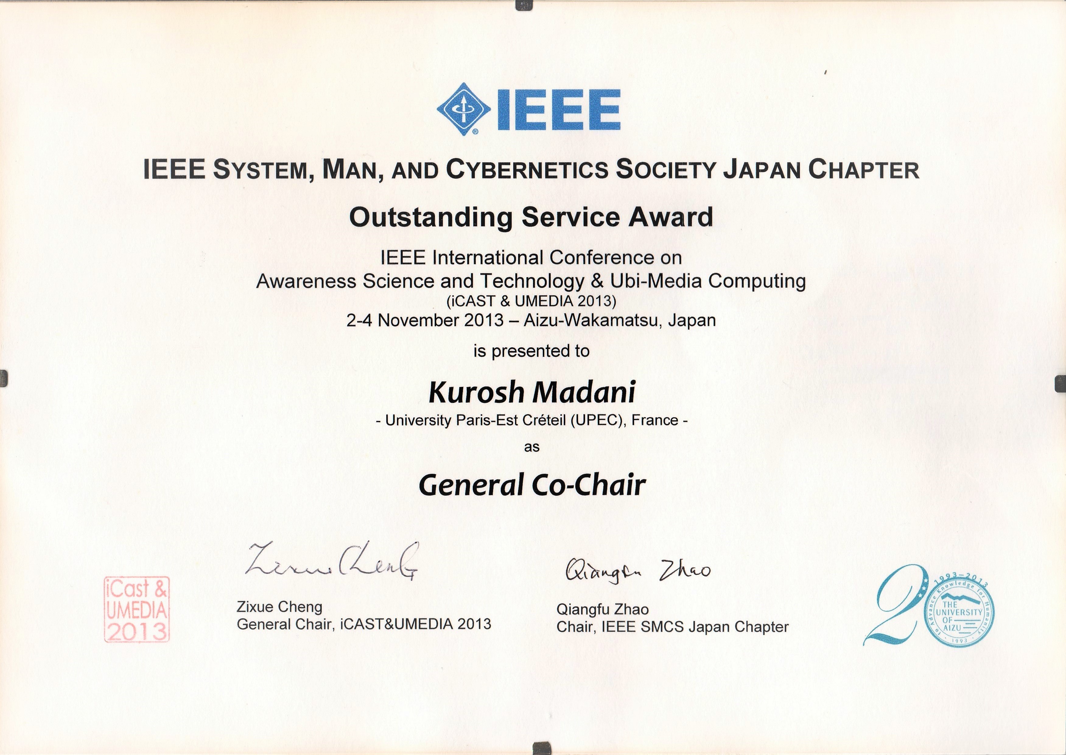 janvier 08th, 2014Kurosh Madani, received the "Outstanding Service Award" from the IEEE System Man & Cybernetics Soc. / Japan Chapter, 2013, in the IEEE International Conference on Awareness Science and Technology, iCAST 2013
