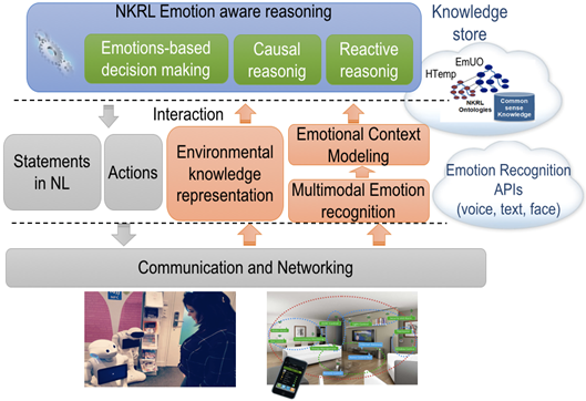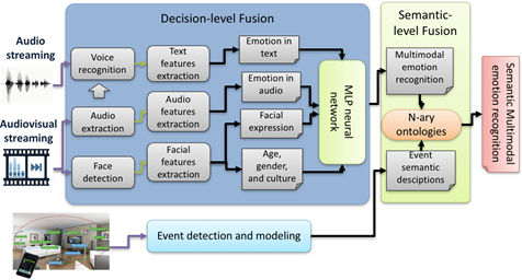 To endow ubiquitous robots with sufficient cognitive capabilities to do an accurate emotion recognition, an hybrid reasoning model for emotion recognition is proposed in this work. This model is based on hybrid fusion techniques that combine information of multiple modalities at different levels. In this paper, hybrid fusion consists of combining, at the low level, features with decisions fusion techniques based on MLP neural network. At the high level, the result of these techniques is exploited by the proposed semantic representation and reasoning models based on NKRL. The architecture of the proposed multimodal emotion recognition system is shown in the following figure.