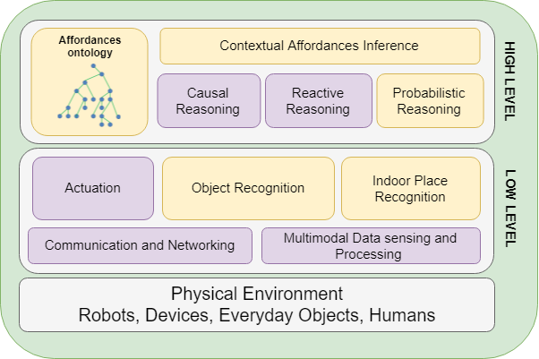 The architecture of the smart system is composed of modules that can predict the contextual object affordances based on place information, can make classification and semantic reasoning for inferring the user's intention, thanks to the combination of Deep Convolutional Networks (CNNs) and Probabilistic Description Logics (DL). The role of the probabilistic DL reasoning is to provide the ability to produce contextual affordances based on low-level object and place information.