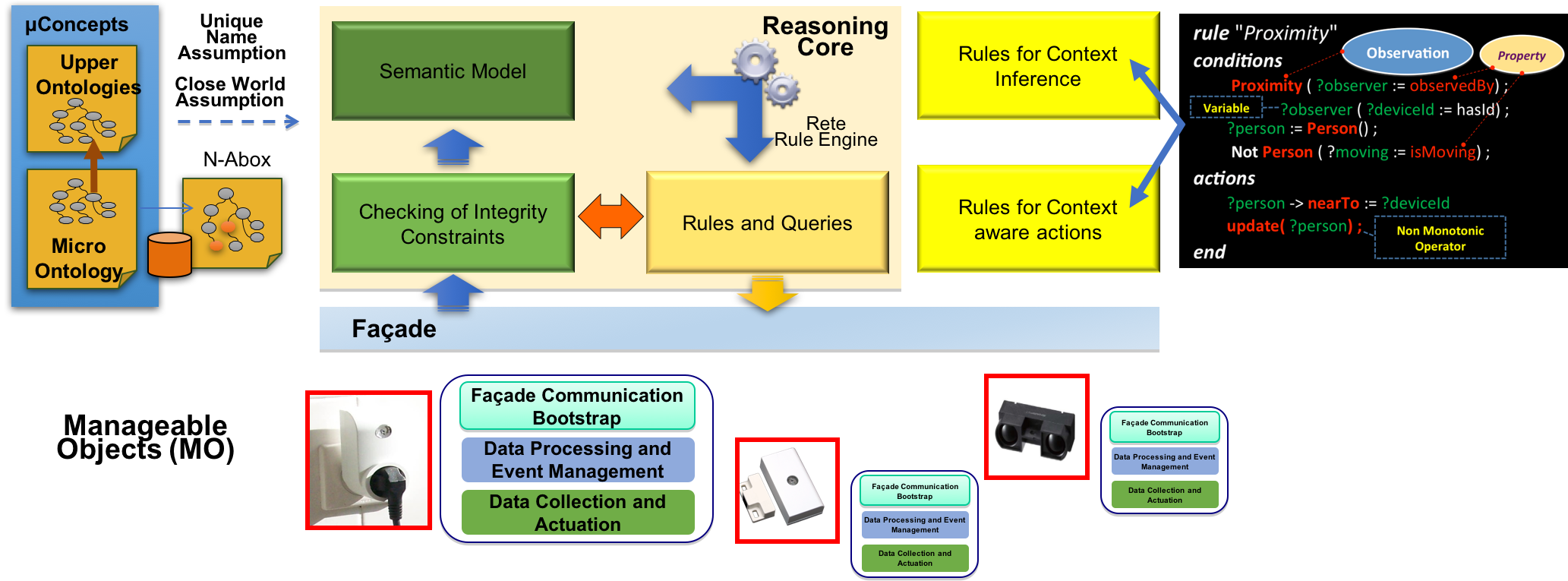 Smart-rules is also an operational platform that allows different IoRT operators to easily set up and handle different real-world heterogeneous entities, which are called manageable objects (MOs). An MO is any physical or virtual object that is manipulated by an IoT system. It includes sensors and actuators, as well as people, home objects, doors, robots and rooms. MOs are represented within the system by interfaces which abstract access to the MO’s state and operations. The architecture of the Smart-rules operational platform, illustrated in the figure above, is composed of two main layers: (1) the reasoning core layer that handles monitoring operations and reasoning, and (2) the façade layer for the interaction with the real-world sensing and actuation devices. The communication is based on java messaging middleware that enables some sorts of asynchronous communications between the two layers. The façade layer abstract the complexity and heterogeneity of the manageable objects. The reasoning core layer is a run-time reasoning system for managing the context logic independently from the complexity and heterogeneity of a IoRT environment.