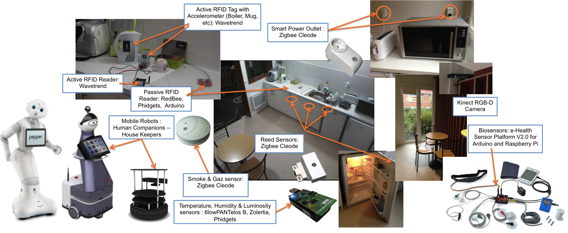 In the living lab premisses are deployed more several wireless sensors and actuators networks that comply with the standards of the Internet of Things such as RFID, Bluetooth BLE, Zwave, Zigbee and 6lowpan. The living lab includes also geo-positioning systems based on Cricket and Ibeacon technologies. 7 mobile companion robots, compliant with ROS, are made available for applications designers and researchers including 4 Aldebaran SoftBank pepper robots, two Willow garage ROS Turtlebot robots and one Robosoft Kompai V1 robot.